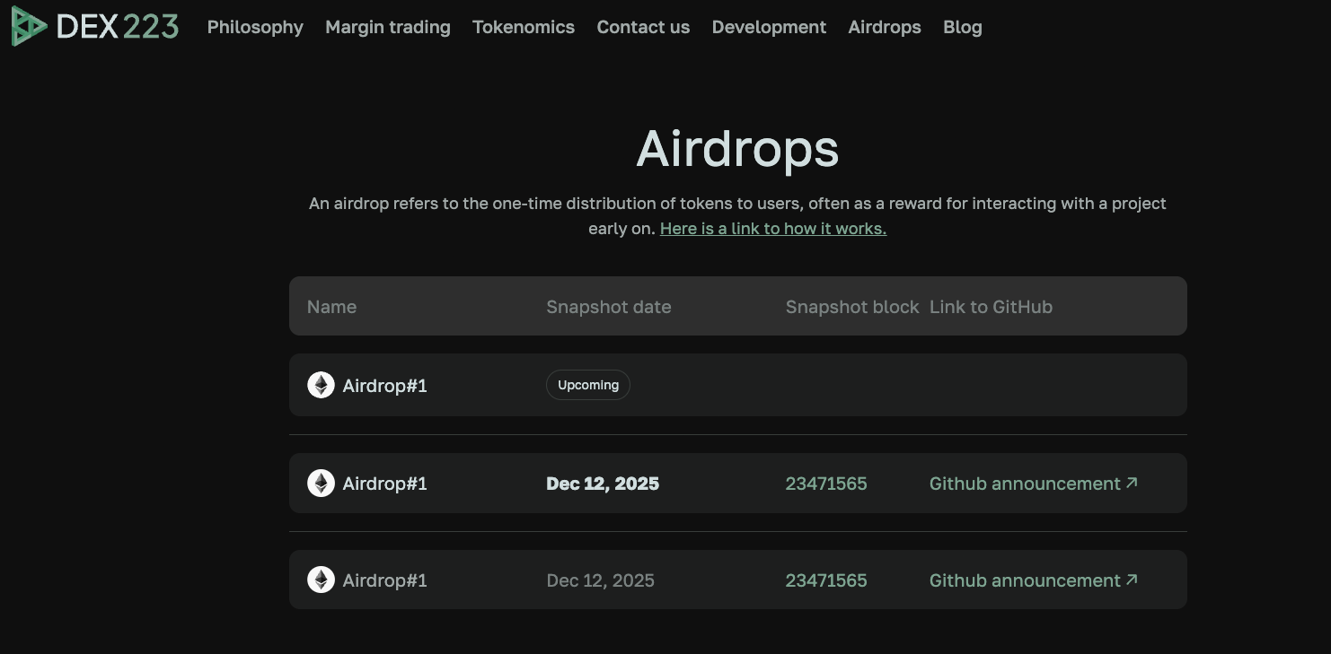 As part of the multi-chain deployment work completed during this period, a dedicated airdrops page was released at https://www.dex223.io/airdrops.